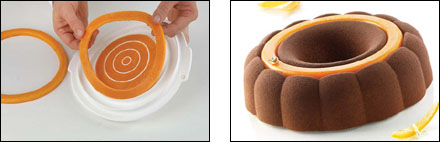 This double-sided silicone mold has 5 channels on each side to make a total of 10 concentric rings of ice cream, chocolate or cake 10mm high (2 of each ring), whose sizes are--rounded up or down to the nearest 5-millimeter multiple--215mm (180mm hole), 175mm (140mm hole), 135mm (100mm hole), 95mm (60mm hole) and 55mm (20mm hole). The bull's-eye center (which doesn't make a ring, just a solid round piece), is 15mm. Overall size of mold 265mm. Temperature resistance -60C to 230C (-76F to 446F).